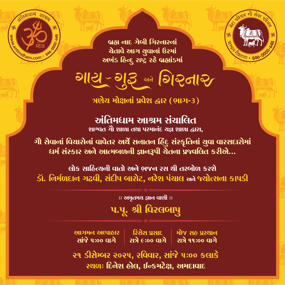 At Antimdham Ashram, under the divine guidance of Pujya Viralbapu, we are dedicated to preserving Sanatan Hindu Values/Dharma, uplifting rural communities, and fostering sustainable living through Gau Seva (Cow Service), Vedic Education, Ayurveda, Organic Cow-based Farming, and Holistic Wellness.